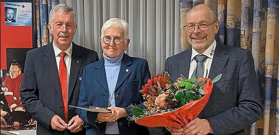 Der Präsident des DRK-Landesverbandes Hessen Norbert Södler überreichte an Edith Wondra die höchste Auszeichnung, die das DRK-Deutschland verleiht, nämlich das DRK-Ehrenzeichen in Gold, zu dessen Verleihung der DRK-Kreisvorsitzende Bernhard Ziegler gratulierte. © Erich Stock